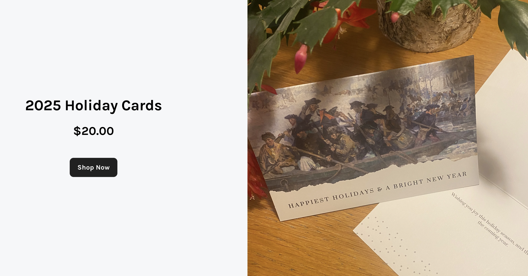 Our 2025 Holiday Cards are available, featuring the George Harding mural of Washington Crossing the Delaware, soon to be unveiled at the park’s new Visitor Museum! Celebrate the Season and our region’s legacy, while supporting the State Park. $20 for 10 high quality cards, with envelopes.